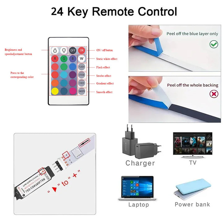 Bluetooth/WiFi 5050 RGB LED Strip - 16M Colors - Remote Control & App - Flexible (1m to 30m) - For TV/Office/Bedroom