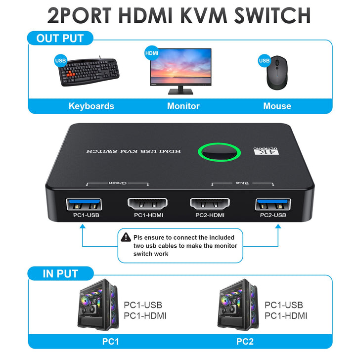2 Port HDMI KVM Switch - Share Mouse/Keyboard/Screen between 2 PCs - Compatible with Windows 7/10/11